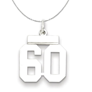 Celebrate your favorite sports player, lucky number or milestone date in your life with a prominent rhodium-plated sterling silver charm. Each polished number is approximately 13mm (1/2 Inch) in length, which is finished with a 2mm top bar and a classic jump ring that will accommodate up to a 3mm chain. Includes a 24 inch, 1.25mm sterling silver cable chain with a lobster clasp closure.