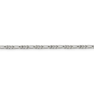 Round and oval links made of polished sterling silver interlock in a reoccurring three and one pattern that closes with a lobster claw clasp. The easy elegance of a flat Figaro chain looks great with dress or casual wear and the 2.5mm width is perfect on its own or paired with other chains for a layered look. 9 inches in length.