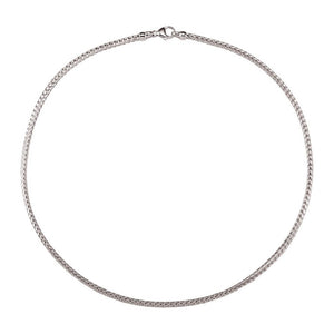 Interwoven links of sterling silver with a tarnish-resistant silver-plated finish form an intricate braided design that will add elegance and beauty to your favorite charm or pendant. This polished foxtail chain closes with a fancy lobster clasp, is 2.75mm in width by 16-inches in length.