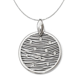 Mesmerizing eclectic style, a polished round pendant fashioned from sterling silver featuring an open web design with white crystal accents. The approximate size is 22mm (7/8 inch) in width by 29mm (1 1/8 inch) in length, which includes bail. Chain sold separately. Made in Italy Includes a 1.25mm, 18 inch sterling silver cable chain.