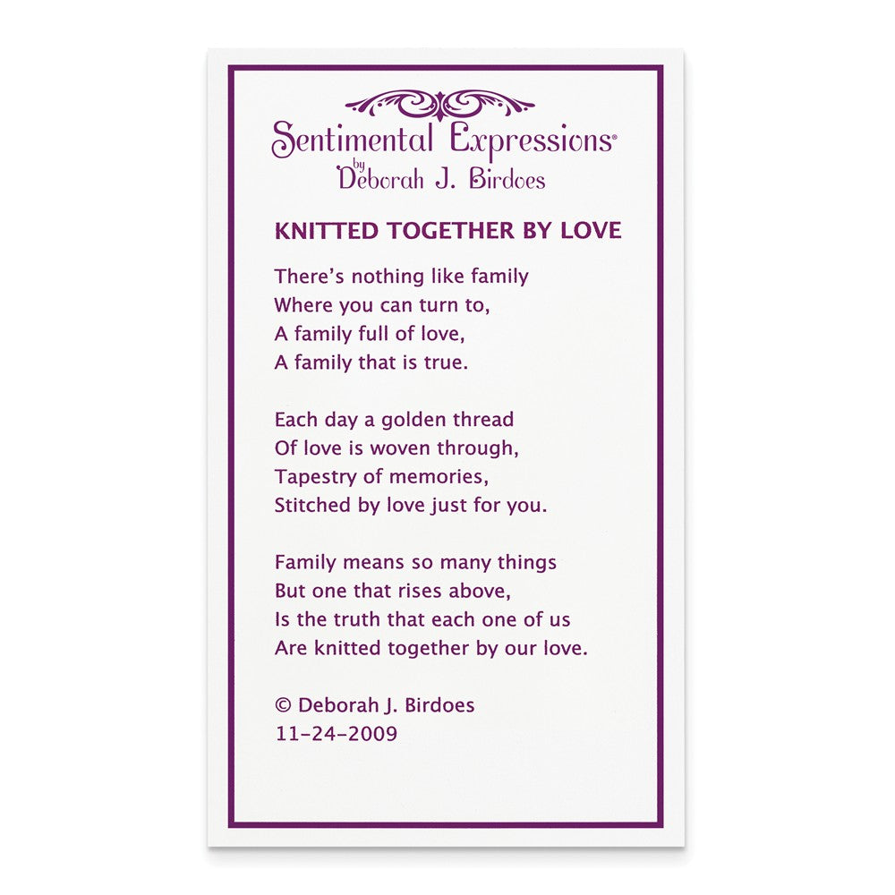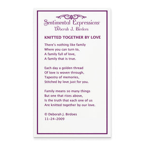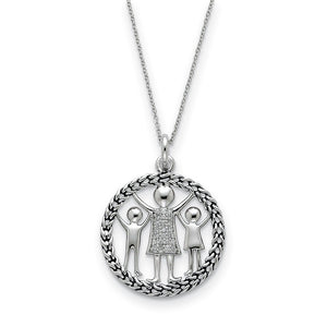 The spirit of family love is captured in this beautiful 30mm (1 3/16 inch) antiqued pendant crafted from rhodium plated sterling silver and clear cubic zirconia gemstones. The cable chain is 18-inches long and closes with a spring ring clasp. Each necklace includes a card with the following inspirational poem written by the artist printed in English and Spanish. There's nothing like family... Where you can turn to, A family full of love, A family that is true. Each day a golden thread... Of love is woven through, Tapestry of memories, Stitched by love just for you. Family means so many things... But one that rises above, Is the truth that each one of us... Are knitted together by our love.