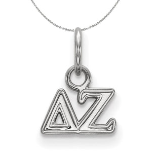 Show your greek life spirit with this Delta Zeta Sorority pendant necklace. It is crafted with rhodium plated sterling silver and without the bail is 6mm in height and 9mm in width (0.24 in x 0.35 in). With the bail, the measurements are 11mm in height and 9mm in width. We are a certified LogoArt retailer and this authentic item is licensed by the Delta Zeta Sorority and Greek Life. This pendant necklace is made the USA. Includes a 16 Inch, 1.25mm cable chain.