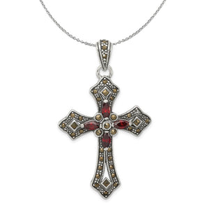 Divine inspiration! A passion cross featuring an intricate jeweled design fashioned from antiqued sterling silver combines an old-world style with a contemporary flair. It is set with marquise-shaped red cubic zirconia and marcasite gemstones and measures approximately 30mm (1 1/8 Inch) in width by 50mm (1 7/8 Inch) in length, which includes the decorative tapered bail. Includes a 1.25mm, 24 inch sterling silver cable chain.