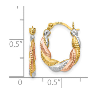 These multi-tone small hoop earrings are crafted from 14k yellow gold with white and rose rhodium and feature a twisted textured design. They measure approximately 13 x 17mm (5/8 inch) and are finished with a hinged post.
