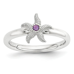 Create a look that is all your own with a fun assortment of rings that looks great alone or stacked in a collection to express your own unique style. This gemstone ring fashioned from tarnish resistant rhodium plated sterling silver features a textured 10mm starfish with a prong set genuine amethyst and a 2. Mm width polished band. The heat-treated amethyst is 2mm in size and the stone weight is 0.3 of a carat. Color range varies on all natural stones so please allow for slight variations in shades. Guaranteed to fit together perfectly with all of the mix and match Stackable Expressions rings.