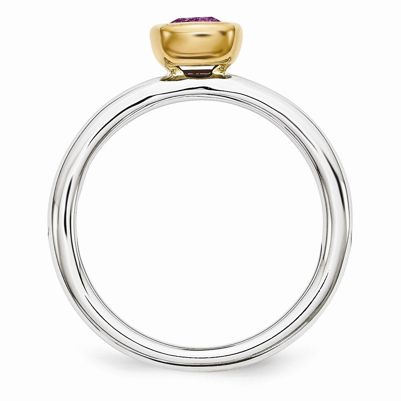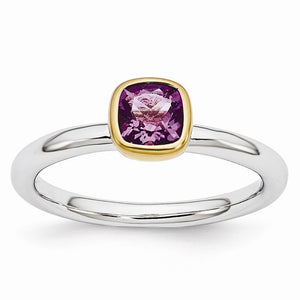 Featured atop a 2.5mm tarnish resistant rhodium-plated sterling silver band is a 5mm 0.5-carat cushion-cut genuine amethyst bezel set in a yellow gold-tone plated low profile mounting. Color range varies on all natural stones so please allow for slight variations in shades. Guaranteed to fit together perfectly with all of the mix and match Stackable Expressions rings.