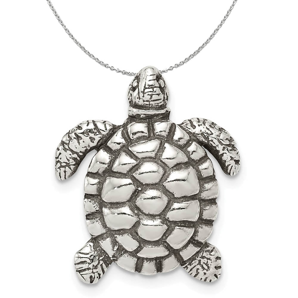 Sea turtles are favored as a symbol of endurance because they have roamed the seas for millions of years, long before dinosaurs became extinct. They are crucial to our ocean and beach ecosystems and figures prominently in the folklore of many cultures. This fascinating creature immortalized in antiqued sterling silver is approximately 18mm (11/16 inch) in width by 22mm (7/8 Inch) in length and features a hidden chain slide. Includes a 1.25mm, 18 inch sterling silver cable chain.