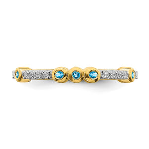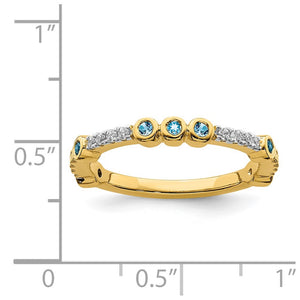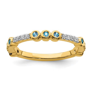 Make it simple and stylish with bands of different textures, finishes, widths and colors or extravagant with diamonds and gemstones! This stackable ring created from solid 14k yellow gold features 5 bezel set blue topaz gemstones totaling 1/8 carat and 8 prong set genuine diamonds totaling .8 of a carat. The natural diamonds are I2 in clarity and I-J in color. The approximate band width is 2mm. Guaranteed to fit together perfectly with all of the mix and match Stackable Expressions rings. The color range varies on all genuine gemstones so please allow for slight variations in shades (bright light to medium light blue). The color on your screen may also not reflect actual gemstone color due to variations in monitors.