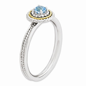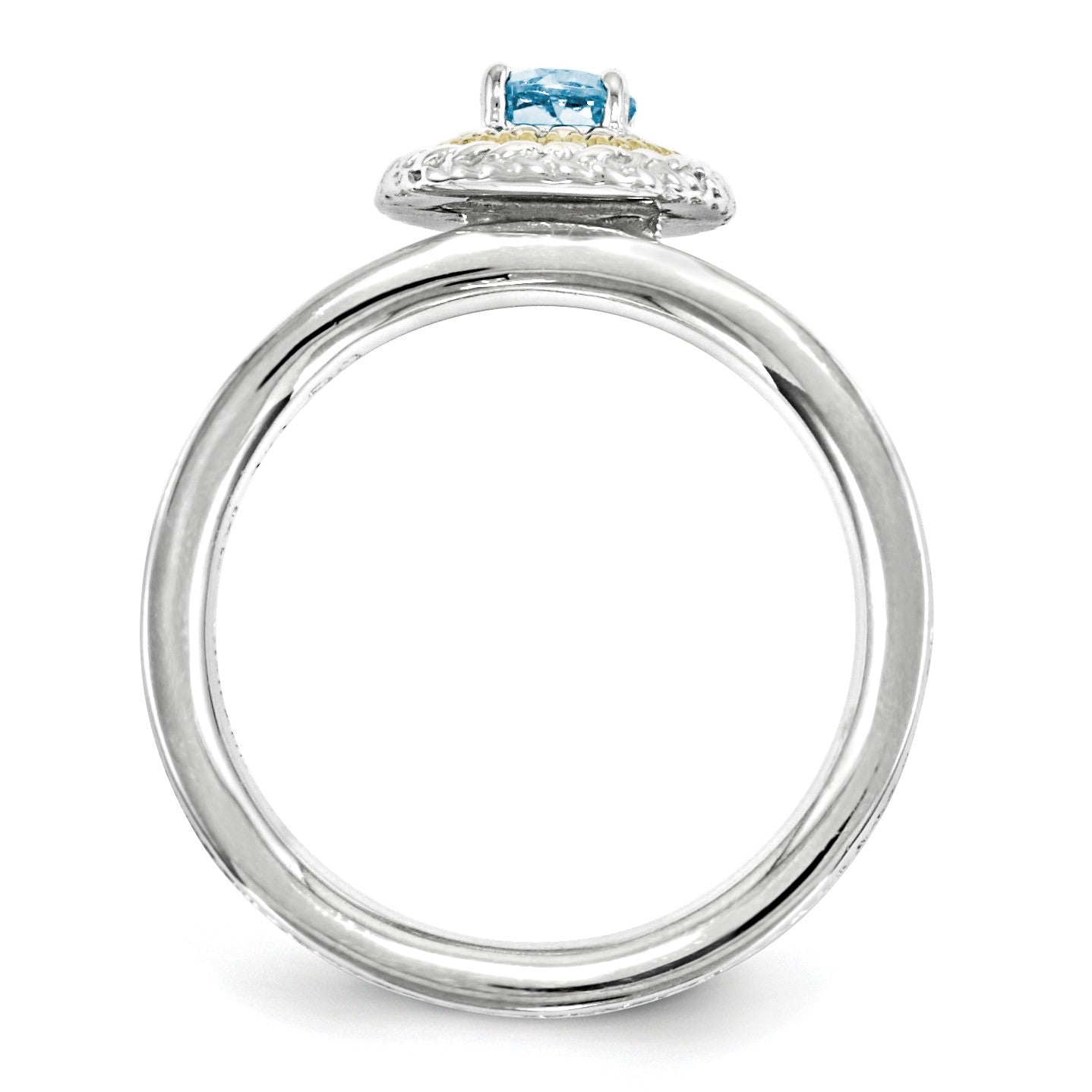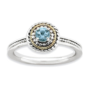 Featured atop a 2.5mm rhodium plated sterling silver band finished with milgrain detailing is a 9mm decorative mounting accented with 14k gold plating that is prong set with a faceted blue topaz gemstone. Wear it alone or featured in a collection. Guaranteed to fit together perfectly with all of the mix and match Stackable Expressions rings This item is backordered. Please allow 7-10 business days for delivery