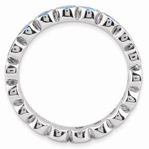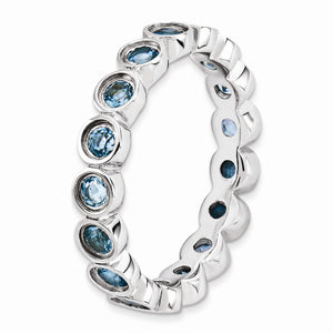 • Blue Topaz, December's birthstone symbolizes eternal love and faithfulness inspiring clarity and concentration. This 3. Mm wide band fashioned from rhodium plated sterling silver is bezel set with 2. Mm round faceted natural gemstones all the way around. The color range varies on natural gemstones so please allow for slight variations in shades. Guaranteed to fit together perfectly with all of the mix and match Stackable Expressions rings.