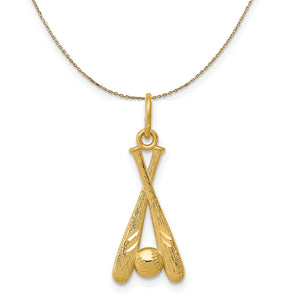Batter up! This gleaming 14k yellow gold pendant features a textured and diamond-cut design with a satin finish that is approximately 8mm (5/16 Inch) in width by 22mm (7/8 Inch) in length, which includes the chain slide. Includes a 24 inch long, 0.9mm wide, solid 14k yellow gold cable chain with a spring ring clasp.