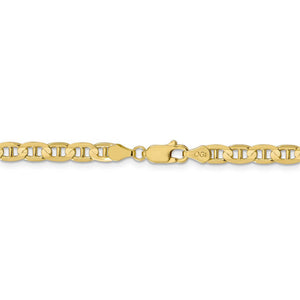 This polished anchor or mariner chain made of 10k yellow gold features a solid concave design that mimics the cable used to anchor boats with a vertical bar in the middle of each link. The 4.5mm width, 7-inch length makes a beautiful bracelet and is perfect on its own or paired with other chains for a layered look. Closes with a reliable lobster claw clasp.