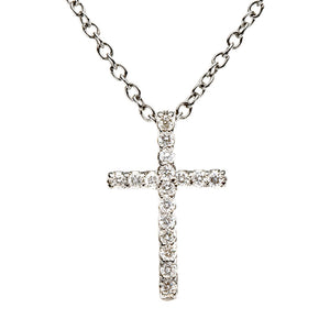 This tiny cross pendant measuring approximately 13mm long by 8mm wide is a sparkling symbol of faith, devotion and trust. It features 17 full cut round diamonds prong set in polished platinum, a hidden bail and includes a matching 16-inch solid cable chain. Total diamond weight is .085 carat. This is a made to order item and is estimated to ship 11/24/2025