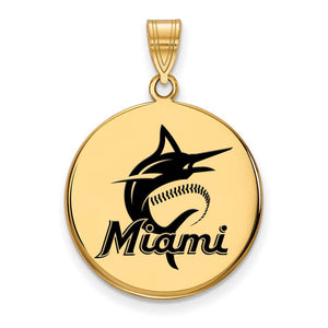 It is time to celebrate your favorite Major League Baseball (MLB) team, the Miami Marlins! We are a certified retailer, and this authentic unisex large laser-cut pendant is officially licensed. It is created from 14k yellow gold plated sterling silver with black enamel and approximately 21mm in width (about the size of a nickel). Enamel colors may vary slightly. The color on your screen may also not reflect actual color due to variations in monitors and browsers. Chain not included. Made in the U.S.A. This item is not currently in-stock. Once you place your order, please allow us 5 to 7 business days to make it for you.