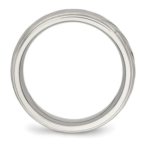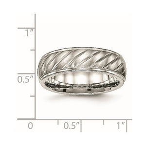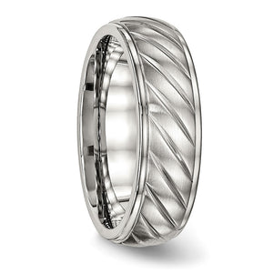 Distinctive style featuring a brushed domed center with a diagonal grooved pattern, polished ridged edges and a standard fit interior designed from 316L stainless steel. This 7mm width unisex band is suitable for engraving.
