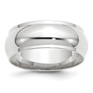 A simple curving band of rhodium-plated 14k white gold combines tradition with today's trends. This polished ring features a dome style center with narrow ridged edges and a standard fit shank. It is approximately 1.4mm in thickness (standard weight) and 8mm in width. Suitable for engraving.