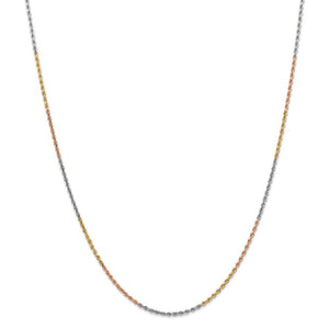 This stunning rope chain handmade from 14k yellow, white and rose gold features a sparkling, diamond-cut design that is finished with a secure, lobster clasp. It measures 1.8mm in width and looks great alone, layered with multiple chains or paired with a gold charm or pendant to complete your desire look. 20 inches in length.
