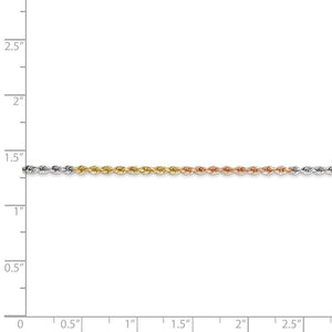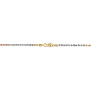 This stunning rope chain handmade from 14k yellow, white and rose gold features a sparkling, diamond-cut design that is finished with a secure, lobster clasp. It measures 1.8mm in width and looks great alone, layered with multiple chains or paired with a gold charm or pendant to complete your desire look. 16 inches in length.