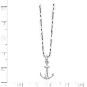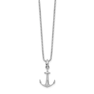 A timeless classic design featuring a diamond accented anchor pendant with an adjustable chain made from tarnish resistant, rhodium plated sterling silver. The polished pendant is approximately 11mm (7/16 inch) in width by 22mm (7/8 inch) in length, which includes the bail. It comes ready to wear on 1mm width, 18 inch long box chain finished with a spring ring clasp and 2-inch extension for flexibility. The natural .003 carat diamond is I2 in clarity and H-I in color.