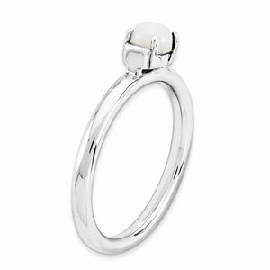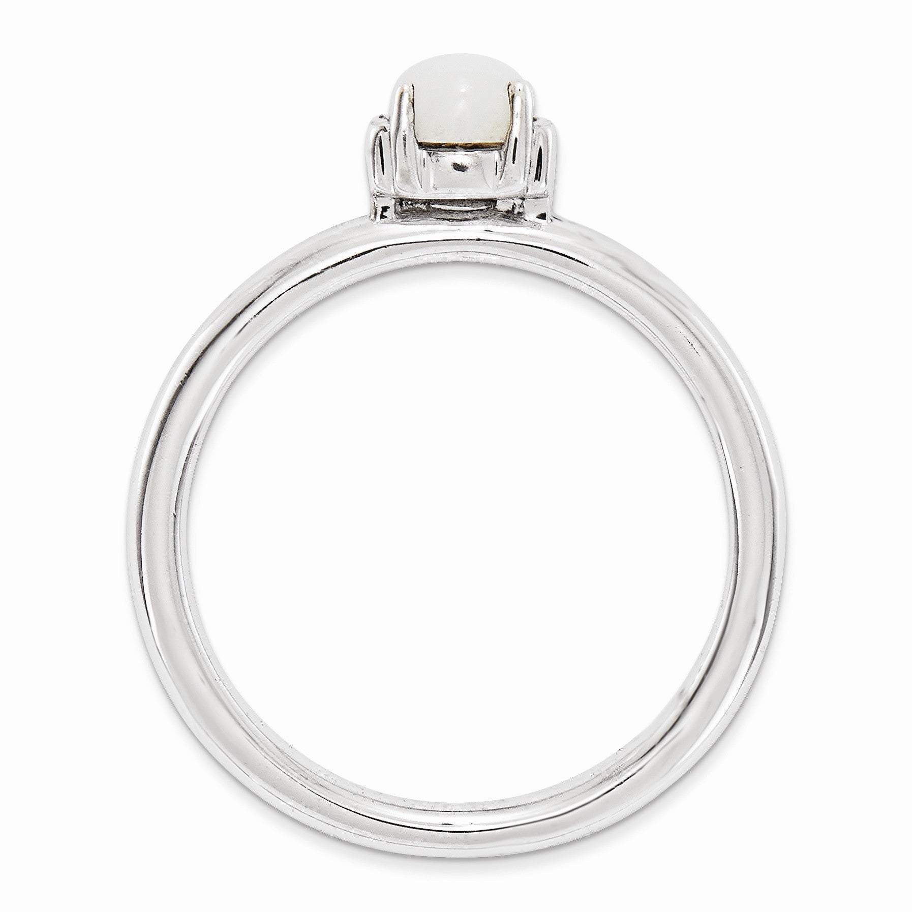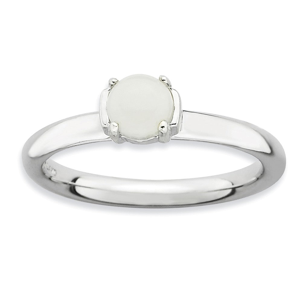 Simply elegant! A polished white agate cabochon is prong set on a 2. Mm gleaming sterling silver band featuring an anti-tarnish rhodium plated finish. Color range varies on all natural stones so please allow for slight variations in shades and size. Wear it alone as a solitaire or featured in a stacked collection. Guaranteed to fit together perfectly with all of the mix and match Stackable Expressions rings.