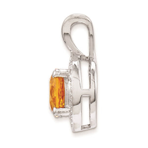 A classic halo style design with timeless style featuring a 6mm round citrine and 2 white diamond accent stones set in tarnish resistant, rhodium-plated sterling silver. This small pendant is approximately 10mm (3/8 inch) in width by 14mm (9/16 inch) in length with the split bail. The 2 genuine diamonds are H-I in color, I2-I3 in clarity and the total diamond weight is .01 carat. The heat treated, genuine citrine weight is 3/4 carat. The color range varies on all genuine gemstones so please allow for slight variations in shades. This item does not include a chain. This item is backordered and we estimate it to ship in approx. 10-12 days. Please email service@theblackbow.com for more details.