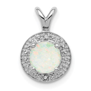 A classic halo style design with timeless style featuring a 6mm round cabochon, lab Cr white opal and 2 white diamond accent stones set in tarnish resistant, rhodium-plated sterling silver. This small pendant is approximately 10mm (3/8 inch) in width by 14mm (9/16 inch) in length with the split bail. The 2 genuine diamonds are H-I in color, I2-I3 in clarity and the total diamond weight is .01 carat. The lab Cr opal weight is 1/2 carat. Lab Cr gemstones like their genuine counterparts can range in color so please allow for variations in shades. This item does not include a chain. This item is backordered and we estimate it to ship in approx. 10-12 days. Please email service@theblackbow.com for more details.
