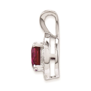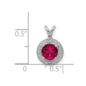 A classic halo style design with timeless style featuring a 6mm round lab Cr ruby and 2 white diamond accent stones set in tarnish resistant, rhodium-plated sterling silver. This small pendant is approximately 10mm (3/8 inch) in width by 14mm (9/16 inch) in length with the split bail. The 2 genuine diamonds are H-I in color, I2-I3 in clarity and the total diamond weight is .01 carat. The lab Cr ruby weight is 0.8 carat. Lab Cr rubies like their genuine counterparts can range from pink to deep red so please allow for variations in color. This item does not include a chain.