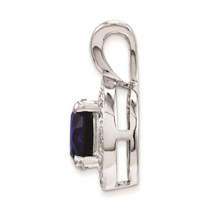 A classic halo style design with timeless style featuring a 6mm round lab Cr blue sapphire and 2 white diamond accent stones set in tarnish resistant, rhodium-plated sterling silver. This small pendant is approximately 10mm (3/8 inch) in width by 14mm (9/16 inch) in length with the split bail. The 2 genuine diamonds are H-I in color, I2-I3 in clarity and the total diamond weight is .01 carat. The lab Cr sapphire weight is 1.0 carat. Lab Cr sapphires like their genuine counterparts can range from deepest midnight to brilliant cornflower blue so please allow for variations in color. This item does not include a chain.