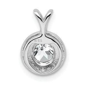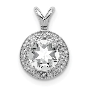 A classic halo style design with timeless style featuring a 6mm round white topaz and 2 white diamond accent stones set in tarnish resistant, rhodium-plated sterling silver. This small pendant is approximately 10mm (3/8 inch) in width by 14mm (9/16 inch) in length with the split bail. The 2 genuine diamonds are H-I in color, I2-I3 in clarity and the total diamond weight is .01 carat. The untreated, genuine white topaz weight is 1.0 carat. The color range varies on all genuine gemstones so please allow for slight variations in shades. This item does not include a chain.