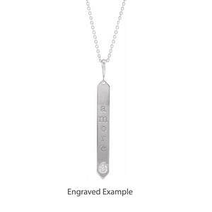 Tie the meaning to the moment with a classic or unusual pendant that makes it personal, thoughtful, or meaningful. This vertical bar necklace crafted in rhodium-plated 14k white gold features a 4.25mm width by 35mm long, polished flat pendant that is suitable for engraving. It includes a 1mm width, solid cable chain finished with spring ring clasp that is 18-inches in length. This is a made to order item and is estimated to ship in about 6-8 days. Please email service@theblackbow.com for more details.