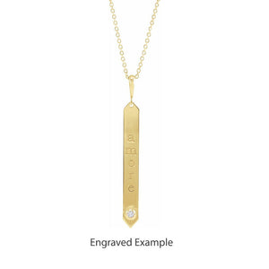 Tie the meaning to the moment with a classic or unusual pendant that makes it personal, thoughtful, or meaningful. This vertical bar necklace crafted in 14k yellow gold features a 4.25mm width by 35mm long, polished flat pendant that is suitable for engraving. It includes a 1mm width, solid cable chain finished with spring ring clasp that is 18-inches in length.
