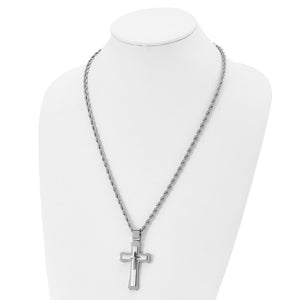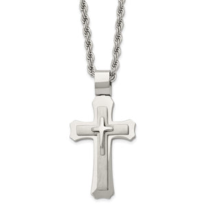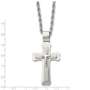 Celebrate and honor all special occasions with jewelry of religious significance! Our collection of spiritually inspired designs that show faith, hope and devotion are perfect for commemorating life's milestones. This men's stainless steel necklace features a large brushed and polished triple cross pendant that is approximately 33mm (1 5/16 inch) in width by 65mm (2 1/2 inches) in length, which includes the bail. It hangs on a 4.5mm width by 24-inch-long polished rope chain that closes with a fancy lobster clasp.