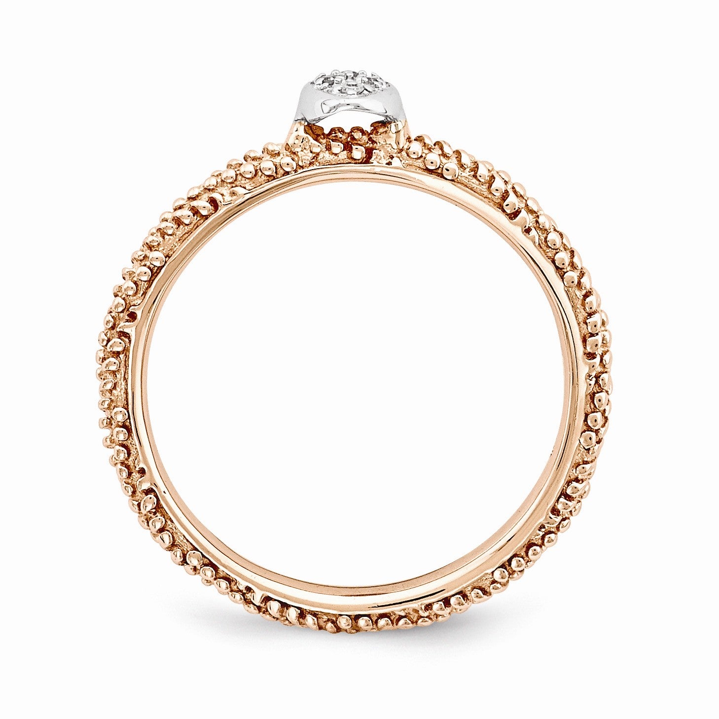 Create a look that is all your own with a fun assortment of rings that looks great alone or stacked in a collection to express your own unique style. This textured ring fashioned from rose gold-tone plated sterling silver features a rhodium plated 7 x 4mm marquise top with pave set genuine diamonds and a 2.5mm width milgrain band. The natural white diamonds are H-I in color, I3 clarity and the total diamond weight is 0.2 carat. Guaranteed to fit together perfectly with all of the mix and match Stackable Expressions rings.
