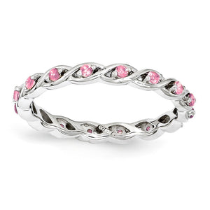 Express your own style with a fresh look for any season by mixing and matching different designs, widths and colors to suit your mood. This 2. Mm width band designed from tarnish resistant rhodium plated sterling silver features a twist design prong set with created pink sapphire stones. The synthetic gemstones are 1. Mm in size and the total gemstone weight is 0.1 of a carat. Wear it alone or in meaningful combinations, guaranteed to fit together perfectly with all of the mix and match Stackable Expressions rings.