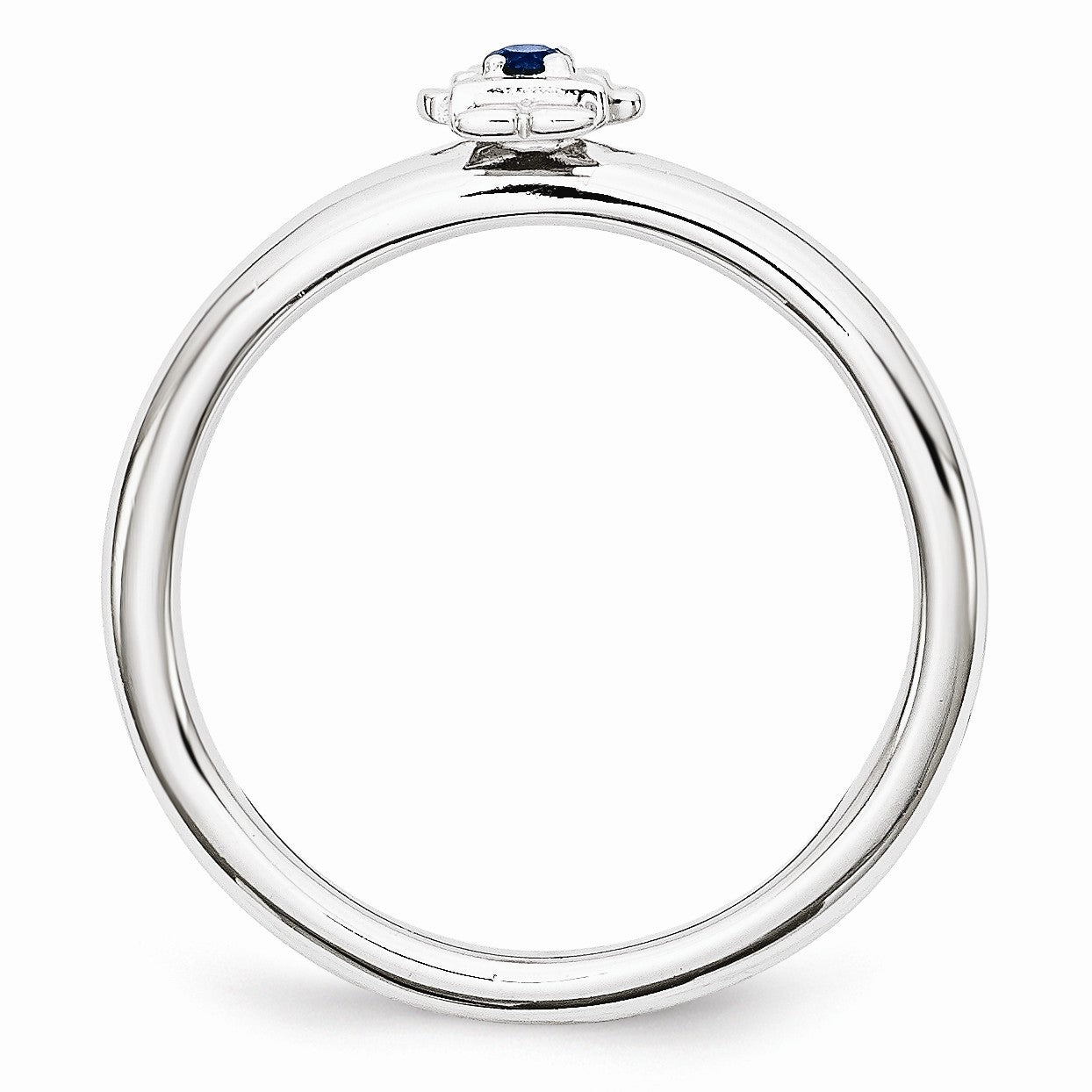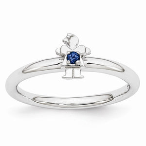 Customize a look that reflects your own unique style with a synthetic birthstone ring designed to celebrate the special people in your life! This polished ring fashioned from tarnish resistant rhodium plated sterling silver features a 7 x 5mm girl prong set with a 0.5 carat created blue sapphire for the month of September and a 2.5mm width band. Created sapphires like their natural counterparts can range from deepest midnight to brilliant cornflower blue so please allow for variations in color. Wear it alone or in meaningful combinations, guaranteed to fit together perfectly with all of the mix and match Stackable Expressions rings.