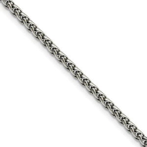 • A seductive chain intricately woven from inert stainless steel features a polished braided wheat pattern with a smooth round design. It measures 4mm in width, 24 inches in length and closes with a fancy lobster clasp.