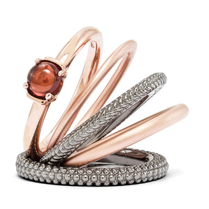 This set of five sterling silver rings includes an 14k rose gold plated genuine garnet cabochon ring, two 14k rose gold plated bands (1. Mm, 2.5mm), and two black ruthenium-plated domed bands featuring a wheat and beaded design. When worn all together the band width measures 11.5mm.