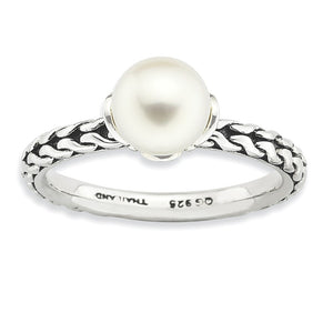 A beautiful 7.-7. Mm freshwater cultured white pearl is prominently set on this 2. Mm rhodium-plated sterling silver band featuring a polished and antiqued patterned design. Guaranteed to fit together perfectly with all of the mix and match Stackable Expressions rings. Pearl treatment: bleached.