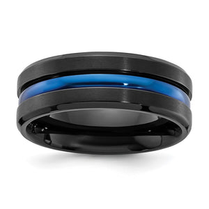 Refine your style with a distinctive ring crafted from black and blue plated titanium that mirrors your unique personality. This 8mm width men's band features a brushed and polished grooved design with polished beveled edges and a standard fit shank. Suitable for engraving.