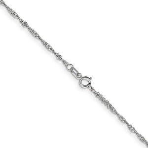 Twisting links of rhodium-plated 14k white gold form a distinctive feminine design that will add unexpected shimmer to your ensemble. This 1.4mm Singapore chain features a solid link construction and a bright, polished finish to give it a radiant glow. It closes with an easy to use spring ring clasp to provide a secure, worry-free fit. 7 inches in length.