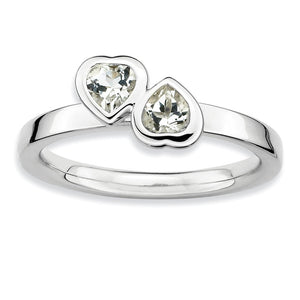 White Topaz, April's birthstone is known as the stone of power, healing and protection; increasing awareness of thoughts and deeds. This 2.5mm smooth polished band features 2 sparkling heart-shaped gemstones bezel set in rhodium plated sterling silver. Guaranteed to fit together perfectly with all of the mix and match Stackable Expressions rings.