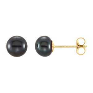• Nothing compares to the beauty and classic sophistication of pearls, the gem of the water and always appropriate. These near-round black freshwater cultured pearls range in size from 7 to 8mm and are affixed to a 14k yellow post with a friction back. Due to the nature of pearls, colors may not match what is shown. Gemstone treatment: dyed.