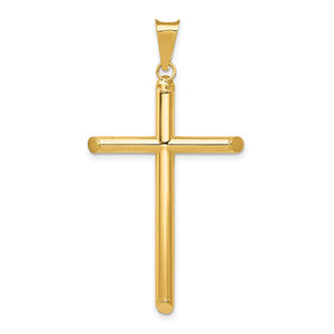 Celebrate and honor all special occasions with jewelry of religious significance! Our collection of spiritually inspired designs that show faith, hope and devotion are perfect for commemorating life's milestones. This polished tube cross pendant crafted in 14k yellow gold features a hollow, 3-dimensional, beveled edge design. The approximate size is 23mm (7/8 inch) in width by 46mm (1 3/4 inch) in length with the bail. This item does not include a chain.