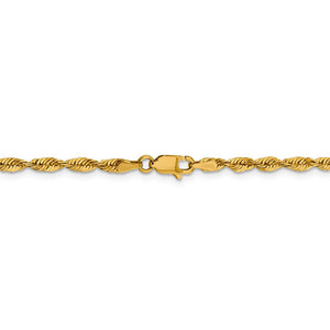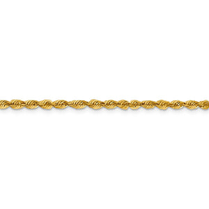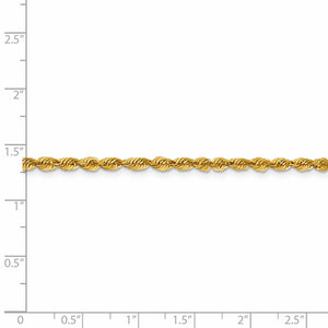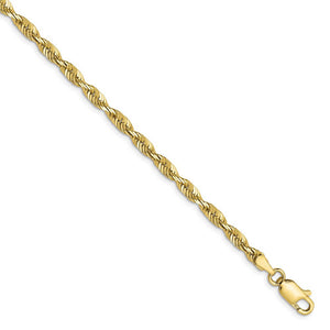 Spiraling rope chains made of 10k yellow gold enhanced with diamond-cuts are extremely popular because they offer a classic design with maximum shine. Flexible and strong, this lightweight, solid link bracelet chain measures 3mm in width by 7-inches in length and fastens with a sturdy lobster-claw clasp.