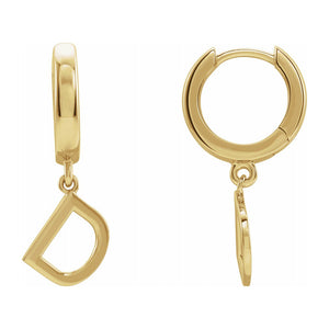 Initial attraction in a classic block style fashioned from 14k yellow gold. Each earring is sold individually so that you can personalize your style with any combination. The small, hinged hoop is approximately 2.25mm in width by 11.5mm (7/16 inch) in diameter. Each charm is approximately 9.5mm in length. Charm widths will vary by initial. Overall length 21mm (3/4 inch).