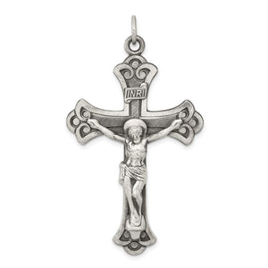 Celebrate and honor all special occasions with jewelry of religious significance! Our collection of spiritually inspired designs that show faith, hope and devotion are perfect for commemorating life's milestones. This fleur-de-lis INRI crucifix cross pendant crafted in sterling silver features a solid, 2-dimensional, antiqued design. The approximate size is 22mm (7/8 inch) in width by 41mm (1 5/8 inch) in length with the bail. This item does not include a chain.