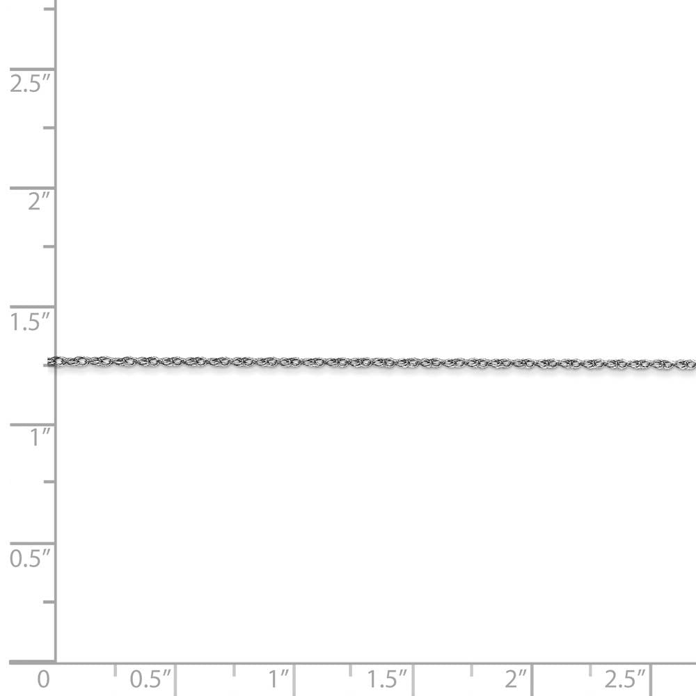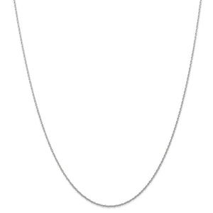 Classic appeal with a modern design, this solid-link cable rope chain created from polished rhodium-plated 10k white gold is finished with a spring-ring clasp and perfect for displaying lightweight charms or pendants. This thin delicate necklace chain is 0.7mm in width by 24-inches in length.