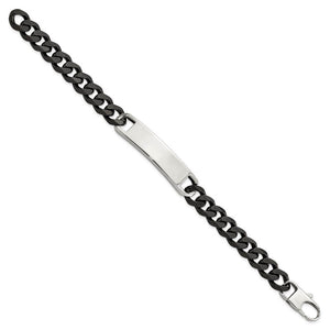 Identify yourself, remember a special person or display a meaningful message with this men's 8.5-inch ID bracelet. It is crafted from polished stainless steel and features a 57mm (2 1/4 inch) long by 11mm (7/16 inch) wide center ID plate. It is, of course, suitable for engraving. The 10.5mm width, black-plated curb chain closes with a fancy lobster clasp.