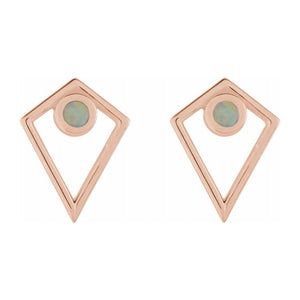 Geometric style, the simplicity of geometric shapes stands out and makes an eye-catching statement. These 11 x 14mm (7/16 x 9/16 inch) pyramid earrings created from 14k rose gold are bezel set with 3mm genuine white opal cabochons. Opal treatment: natural, not enhanced. Total gemstone weight for the pair is .14 of a carat. The color range varies on all genuine gemstones so please allow for slight variations in shades (semi translucent to opaque, play of color in range of hues). This is a made to order item and is estimated to ship in about 6-8 days. Please email service@theblackbow.com for more details.