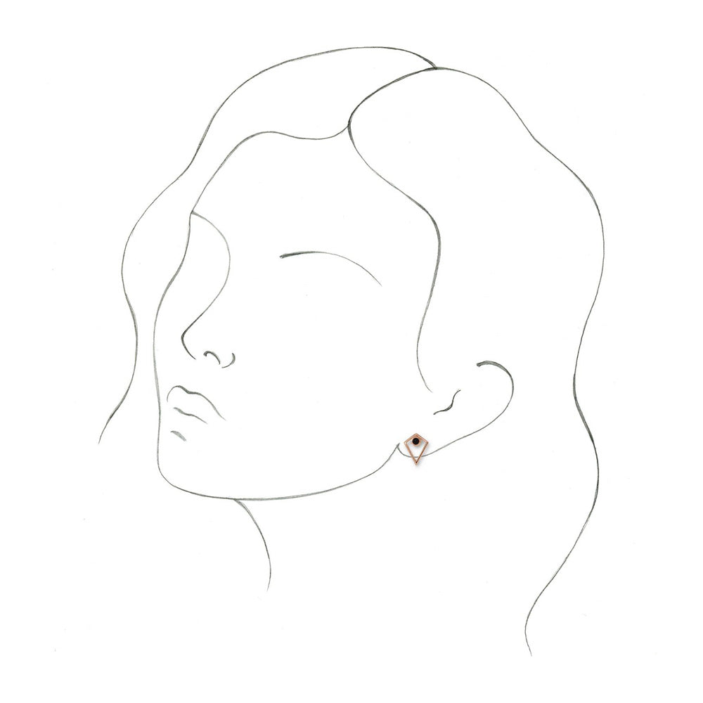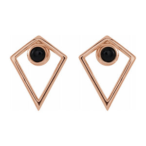Geometric style, the simplicity of geometric shapes stands out and makes an eye-catching statement. These 11 x 14mm (7/16 x 9/16 inch) pyramid earrings created from 14k rose gold are bezel set with 3mm genuine black onyx cabochons. Onyx treatment: traditional dying. Total gemstone weight for the pair is .18 of a carat. The color range varies on all genuine gemstones so please allow for slight variations in shades. This is a made to order item and is estimated to ship in about 6-8 days. Please email service@theblackbow.com for more details.